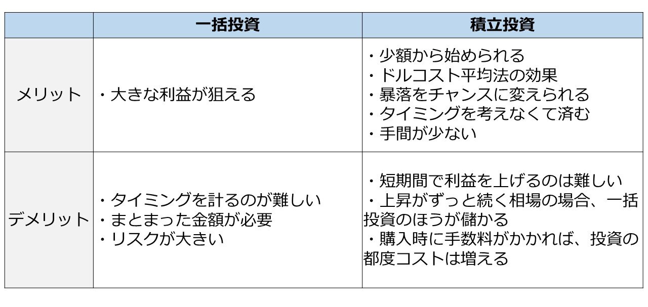 投資の方法には、大きく分けて一括投資と積立投資があります。一括投資は、金融商品に一度にまとめて投資する方法。対する積立投資は、金融商品に毎月・毎週・毎日など一定の間隔で投資する方法です。