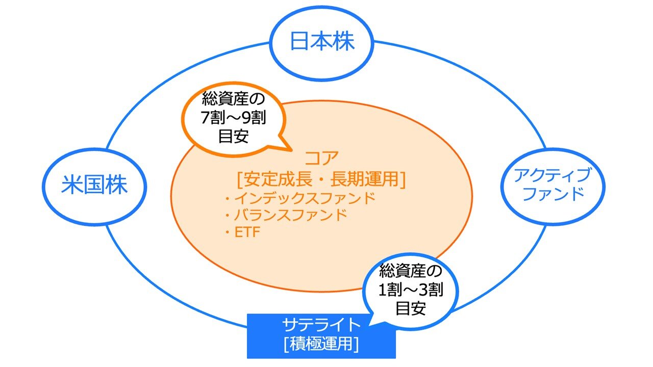 コア・サテライト戦略は、自分の資産の7〜9割を長期安定成長の「コア資産」、残りの1〜3割を積極運用の「サテライト資産」に分けて運用する戦略です。