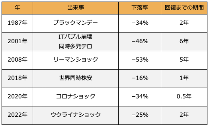 市場を揺るがすような大きな出来事があると、株価は一時的に暴落します。しかし、それで市場がなくなるようなことはなく、やがて値上がりし、暴落前の水準を突破しています。