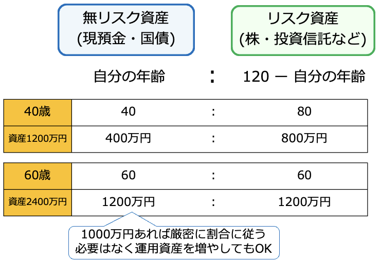 自分が保有する資産に占める無リスク資産(現預金・個人向け国債)とリスク資産(株式・投資信託など)の割合を確認しましょう。無リスク資産とリスク資産の割合は、「自分の年齢」と「120から自分の年齢を引いた数字」で考えるのがひとつの目安です。