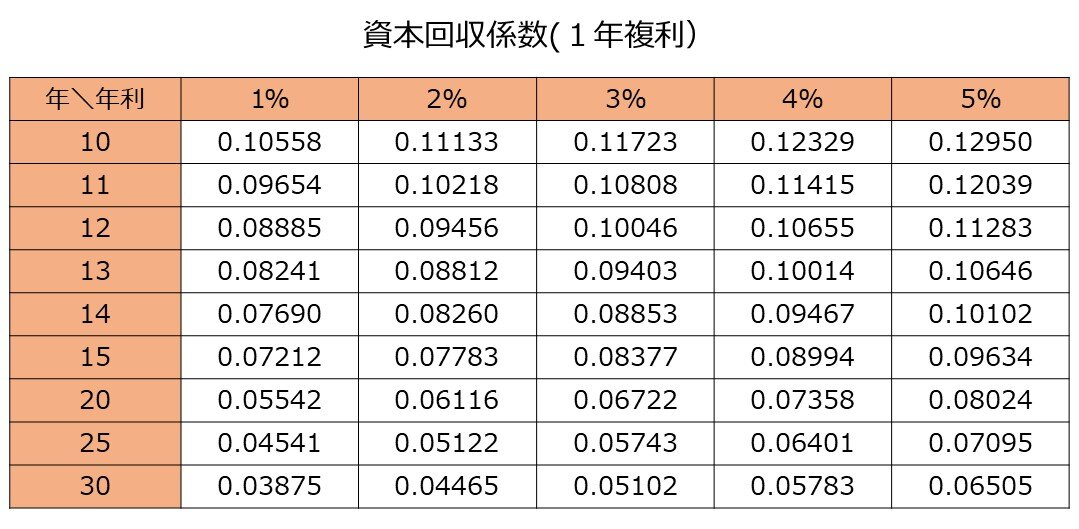 一定の利回りで運用しながら、資産を取り崩した場合、毎年いくら受け取れるかを計算する「資本回収係数」という数字があります。