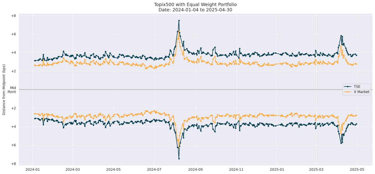 上記は、4/1~30の期間の最良気配とジャパンネクスト証券のX-Marketの最良気配の単純平均を比べたものです。