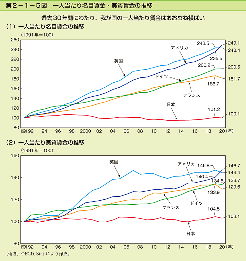 図表1・各国の名目・実質賃金の推移