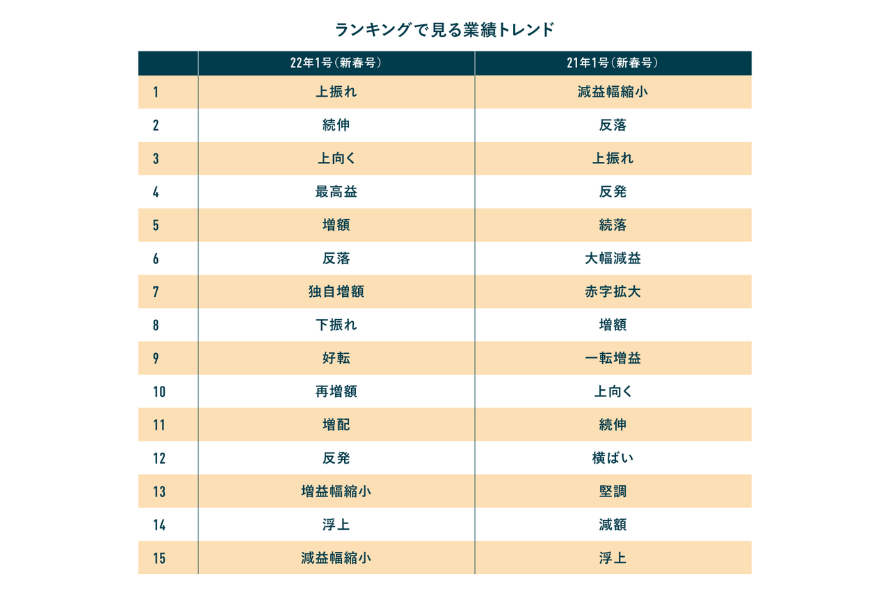 このランキングで「堅調」や「回復」などポジティブな単語が多い号は、日本経済も好調。逆に「反落」や「減額」などネガティブな単語が多い号は、日本経済も不調だと推測できますね。