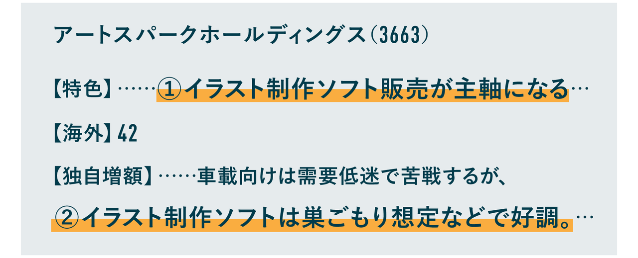 加えて、四季報には「【海外】42」とも書かれていました。【海外】は海外の売上高比率のことですが、アートスパークは42%と、世界中の市場で売上を上げていることがわかります。また、業績についても営業利益に伸びが見られました。