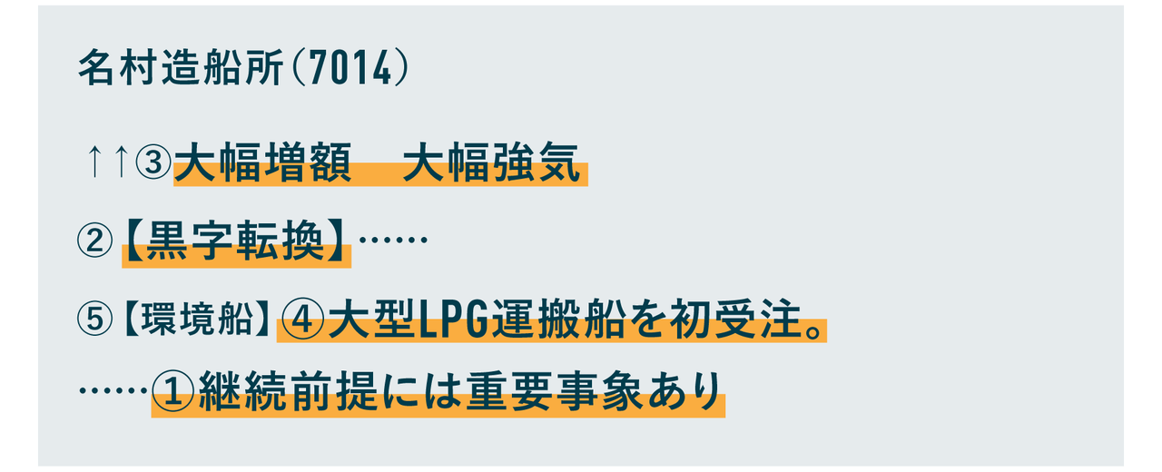 藤川さん:2022年春号には、業績記事の最後に「①継続前提に重要事象」と書かれています。要は存続が危うい企業ということですね。そんな名村造船所ですが、「②【黒字転換】」とも書かれています。
