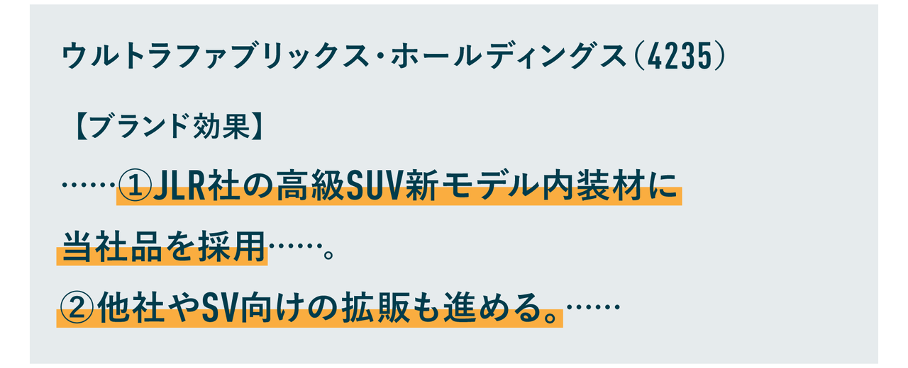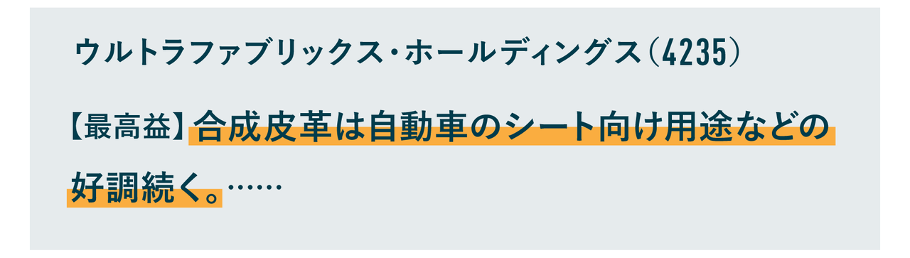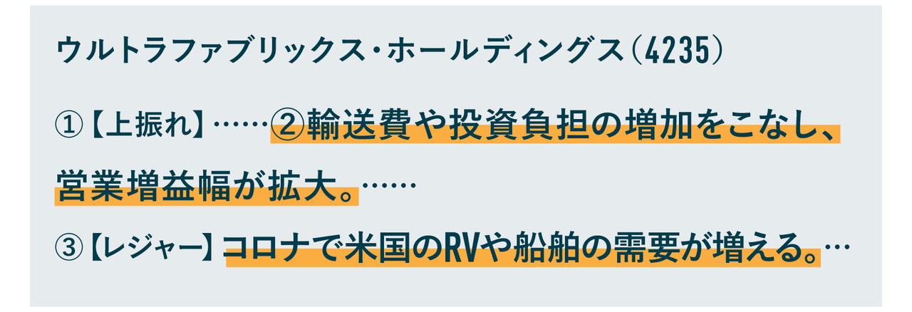 というのも、あまり調子の良くない企業は、同じ輸送費が増えた状況下では「輸送費増が負担」や「輸送費増で減益」などのネガティブな記載があります。しかし、このウルトラファブリックスは輸送費や投資負担の増加を“こなし”て営業増益幅を拡大させています。負担増加を乗り越えられる、これは非常に良い傾向ですよね。