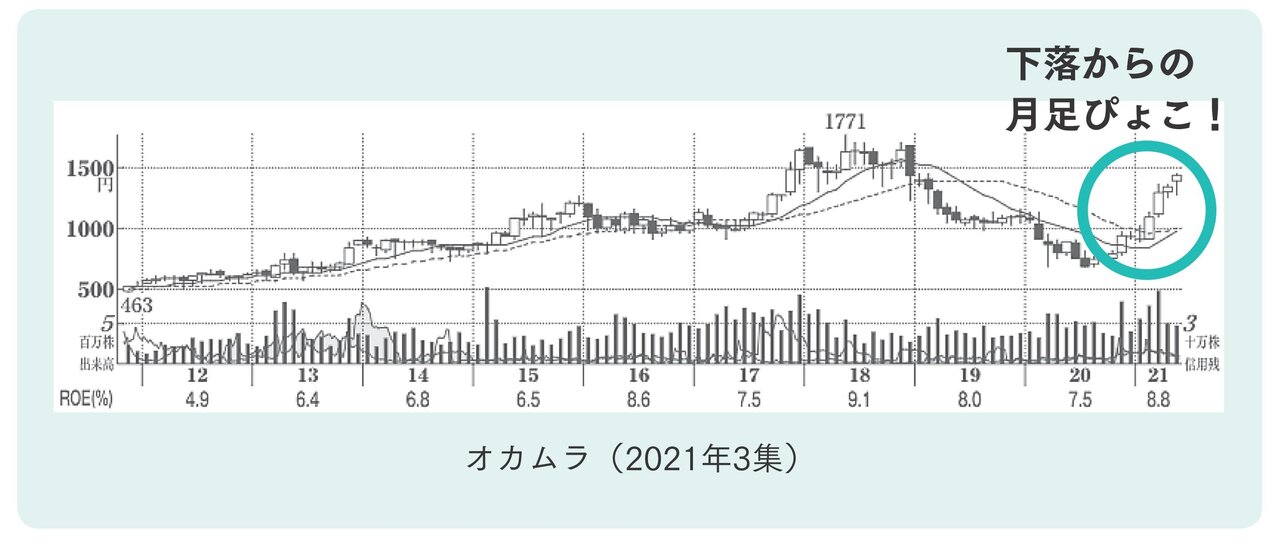 ー下落または横ばいの月足チャートで、直近の陽線がぴょこっと1本立った銘柄ですね。「ぴょこ」と表現されているのは、直近の成長が著しい印なんですね。