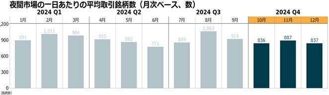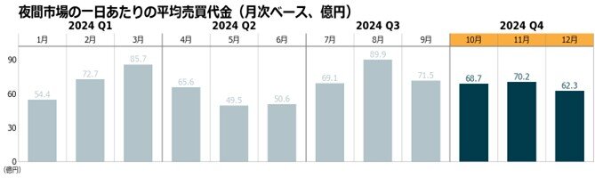 2024年の「夜間市場」の一日あたりの平均売買代金は約68億円でした。直近四半期の平均売買代金は概ね平均的でしたが、10月と11月にはそれぞれ三回ずつ、売買代金が100億円を超える日がありました。