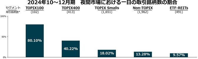 直近四半期の「夜間市場」では、1日に平均853銘柄が取引されました。セグメント別でみると、TOPIX100が約8割、TOPIX400では約4割の銘柄が取引され、TOPIX SmallまたはNon-TOPIXについて、割合は限定的であるものの、銘柄数としては約560銘柄が取引されました。