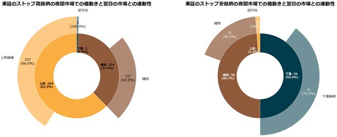 上記のグラフは、左側がストップ高、右側がストップ安となった銘柄の数(割合)を示しています。例えば、10月~12月の期間にストップ高となった銘柄は576ありました。そのうちの62%(359銘柄)は「夜間市場」においてさらなる値上がりがみられました。また、そのような銘柄のうち66%(237銘柄)は、翌日の東証においても価格の上昇が継続しました。