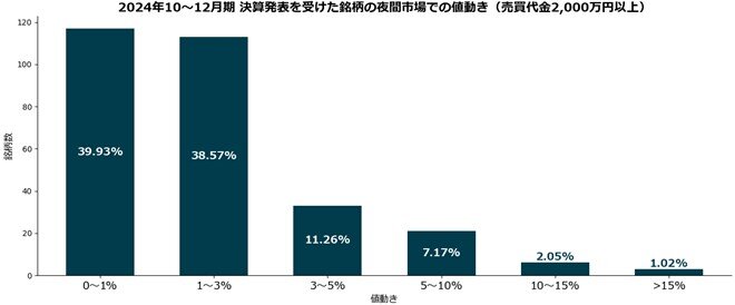 上記の棒グラフは、直近四半期に決算発表をした銘柄のうち、「夜間市場」での売買代金が2000万円以上のものを抽出し、価格の変動幅がどの程度だったかについてまとめたものです。これをみると、決算発表後の「夜間市場」で3%以上の値動きがあった銘柄が21%程度あったことがわかりました。