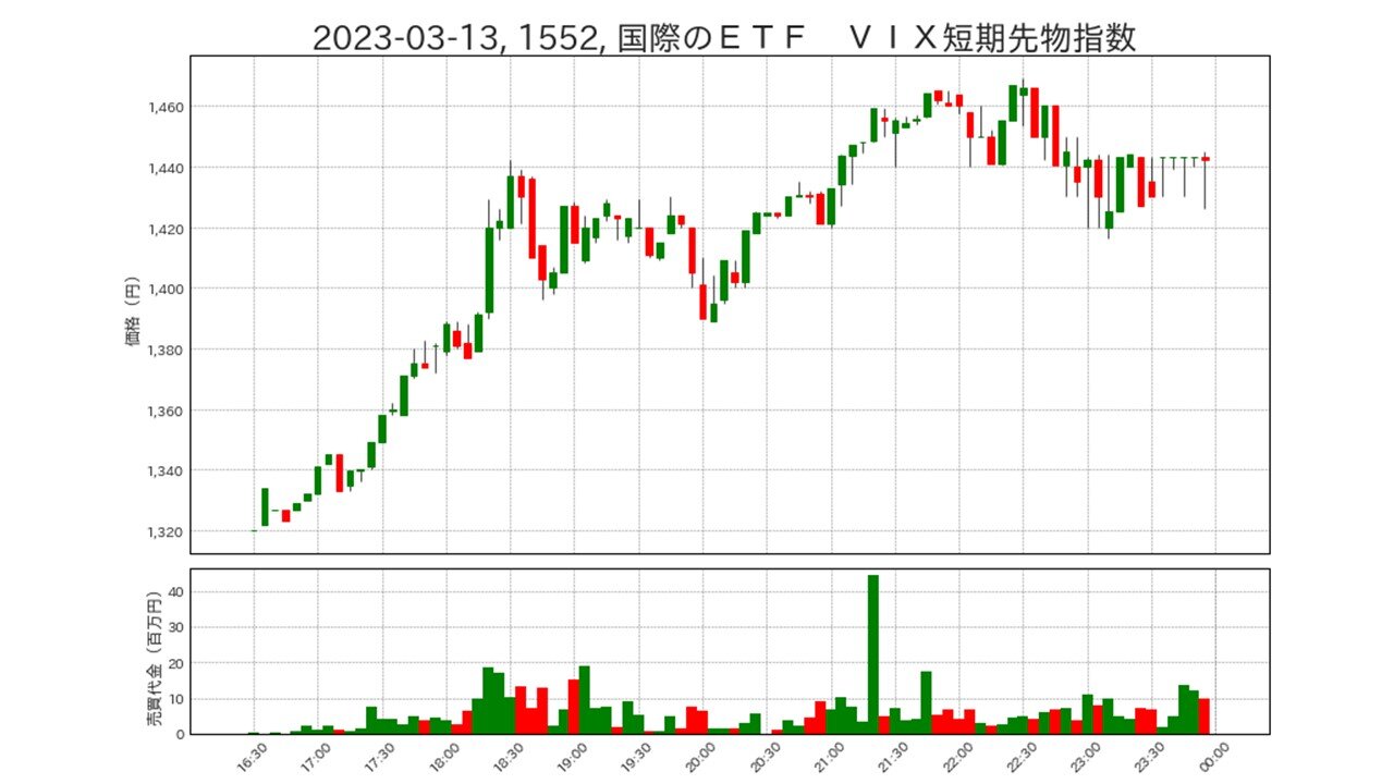 3月13日「VIX短期先物指数」は概ね1,320円~1,470円で動き、14日の東京市場では1,401円~1,433円の価格推移でした。14日の日経平均株価終値は610円安でしたので、リスクヘッジに成功した投資家も少なくなかったとみられます。