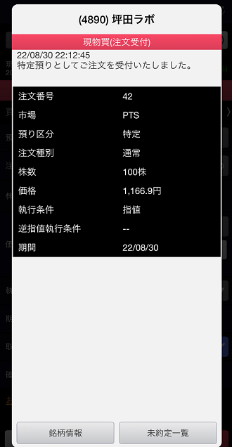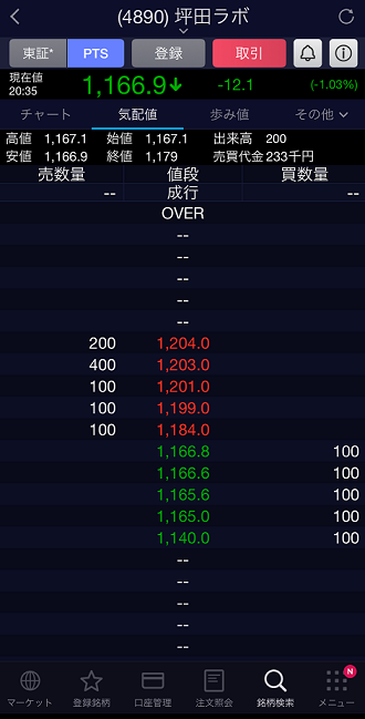 以前もお話ししましたが、わたしは日中売買しているメイン口座と、夜間取引で使っているサブ口座が分かれているため、日中にサブ口座を見ることはほとんどありません。そのため値動きが気にならず、結果サブ口座で買った銘柄は長期保有しています。坪田ラボも、もし買えたとしたらそのまま忘れて3年くらいたったときにびっくり!みたいな展開が期待できます。またもや、”捕らぬ狸の皮算用”でニヤニヤしながらPTSの板を確認しました。
