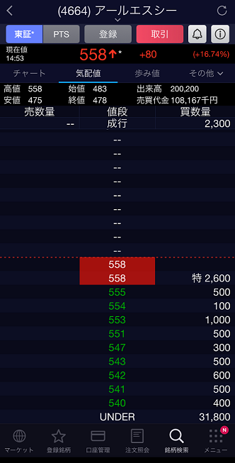 31日のストップ高銘柄から比較的低位のアールエスシー(4664)をチョイス。総合ビル管理会社で、人材派遣なども行っています。正直、あまりこの銘柄のことは知りませんが、短期売買ですので、ファンダメンタルよりも受給が重要だと思います。時価総額が20億円以下の超小粒ですが、日中の取引の板を見ると買いの勢いがとても強い!