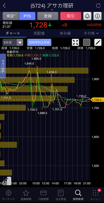 感度のよい投資家さんたちが、そのニュースに飛びつき、都市鉱山銘柄が幅広く物色されました。その中でわたしが、夜間取引のために目をつけたのは、アサカ理研(5724)。日中ストップ高をつけており、時価総額は90億円弱と小粒です。うまく安値で拾えれば、数日間は株価がぐんぐん上昇するかもしれない。”捕らぬ狸の皮算用”でニヤニヤしながら日中の取引終了を見届け、夜間取引に備えました。