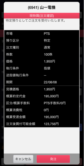 わたしは、好決算に見えても売られるといったトラップを避けるため、決算発表翌営業日は売買しません。値動きを見てから判断することにしていますので、8日(月)の値動きを見て、その日の夜間に買おうと決めました。日中取引の終値は2,100円でしたが、それより安い1,950円で指値注文を出しました。