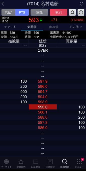 夜間取引が始まり、板を見ると現在値は593円と日中の終わり値よりかなり高くなっています。ここで注文を出すかどうかは悩み所ですが、わたしの経験上、500円くらいの低位株がストップ高になると翌営業日も続けてストップ高になる傾向があります。だとしたら夜間のうちに多少高くても買っておくべきでは?