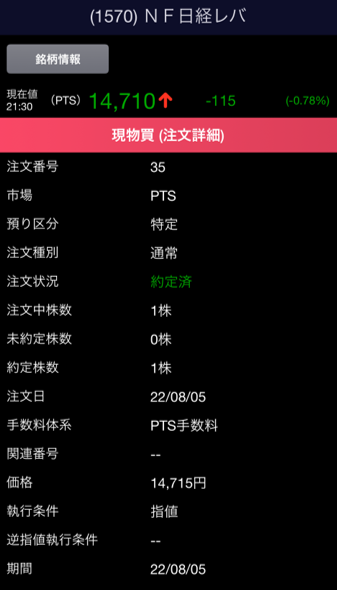 正直、これが上がっても下がっても、一株だけなのでそれほど大きなインパクトにはなりません。まずは夜間取引をしてみることが目的でしたので、第一弾としては大成功といえます。