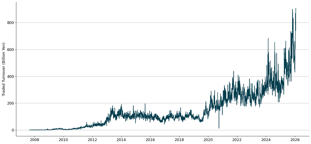 2026年2月現在、日本の売買代金は米国の約15分の1(7%)に留まっています。GDP比(約14%)や時価総額比(約11%)を鑑みれば、日本の売買代金は現在の2倍、22兆円程度あっても然るべきです。スタートアップをはじめとする未公開株市場の創設も重要ですが、まずは既にある上場株市場の流動性を、米国並みの効率性に引き上げることが先決です(上場企業の数は日米でほとんど差はありません)。